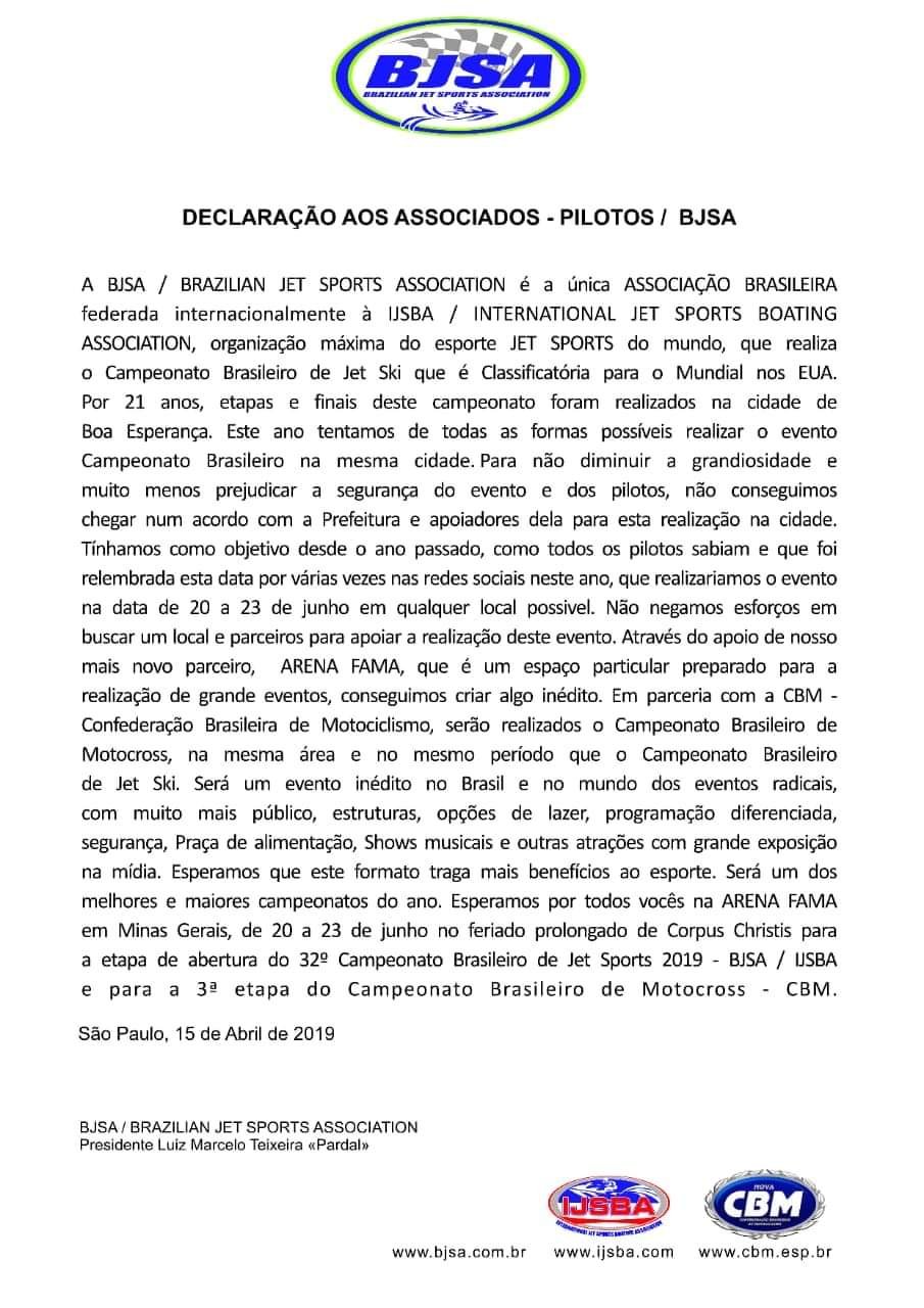 Saiu o calendário da 1° etapa do campeonato Brasileiro de JetSki, será de 20 á 23 de junho de 2019 na cidade de Fama – MG, além disso essa etapa irá contar com a 4° etapa do campeonato Brasileiro de MotoCross, ou seja, um evento duplo, muita adrenalina na água e na terra.